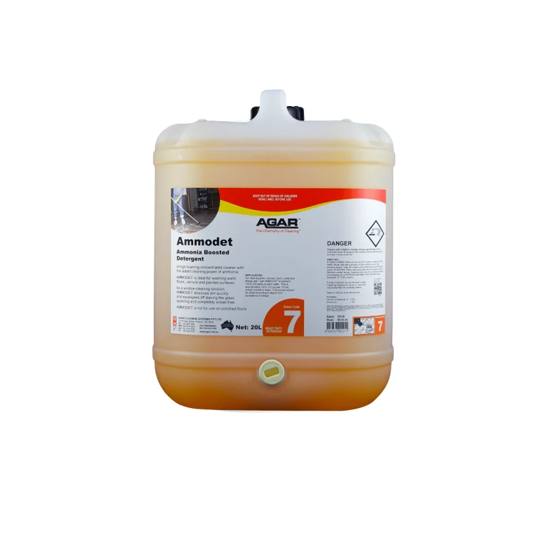 The AGAR AMMODET is a highly concentrated, ammonia-boosted heavy duty detergent available in two sizes (5 L and 20 L). Designed for commercial and industrial use in Australia