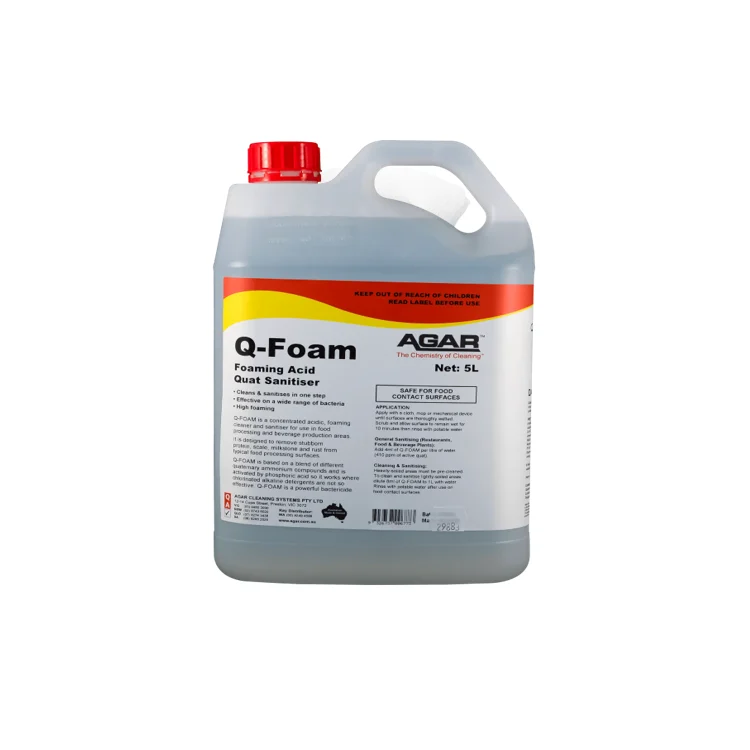 AGAR Q-FOAM – 20L is a powerful acidic foaming cleaner and sanitiser designed for food processing plants, beverage production facilities and commercial kitchens